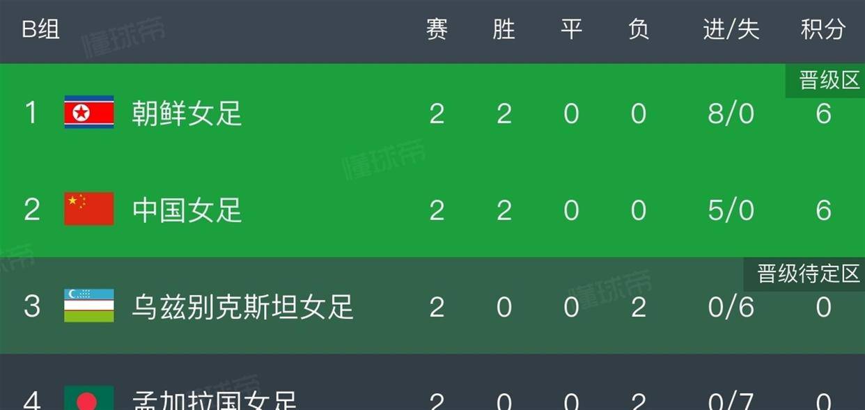 小组积分形势非常微妙。 朝鲜女足在前两轮比赛中展现了强大的攻击力,先是3-0击败乌兹别克斯坦,随后5-0大胜孟加拉国,两场比赛打进8球且一球未失,净胜球为 8。 中国女足同样保持零封,分别以2-0和3-0战胜了孟加拉国和乌兹别克斯坦,但净胜球为 5。 这意味着朝鲜队目前以3个净胜球的优势排名小组第一。 根据规则,本场比赛朝鲜队只需一场平局即可确保小组头名,而中国队则必须取胜才能实现反超。