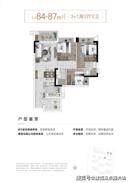 86㎡3+1房:布局方正,动静分区清晰,比84㎡户型空间更宽敞一些,性价比更高。该户型厨房连接生活阳台,晾晒与储物功能兼顾,日常洗衣、晾晒十分方便,不用再占用客厅或卧室的空间;客厅开间宽敞,采光通风良好,能够满足家庭日常休闲、会客需求;三个卧室布局合理,隐私性良好,主卧带飘窗,能够增加空间的采光和实用性;拓展空间可以作为儿童房,适合有小孩的刚需家庭,首付15%仅需75万即可入手,压力小、实用性强,深受刚需家庭的喜爱。